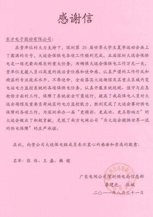8月23日,世界大学生运动会在深圳圆满落幕,北京博晓科技发展有限公司作为大运会唯一保电企业见证了世界大学生体育运动的蓬勃发展。北京博晓科技发展有限公司技术中心系统部与工程部坚守“忠于职守,全力以赴,誓保大运电网安全”的信念,联手实现了大运保供电期间系统零故障、零缺陷的目标。